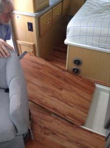 The next job that Murray attacked was removing the carpet in the Railta and replacing it with a waterproof vinyl click flooring. What an awful job that was! As he tore the carpet out, he discovered that they had glued foam down to the floor, under the carpet. Using gallons of glue, at least it seemed that way. We tried heat – that didn’t work at all but just got stickier. Eventually he came up with a method that worked. The finished job is lovely.